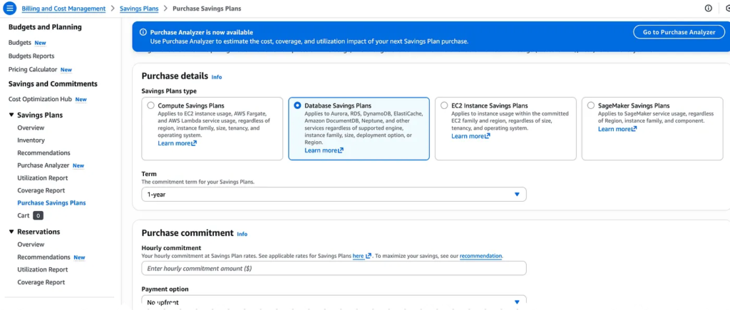 Os Database Savings Plans surgem para resolver exatamente esse ponto. Em vez de você se comprometer com uma instância específica, você se compromete com um valor de gasto por hora em serviços de banco de dados, por um período de 1 ano.